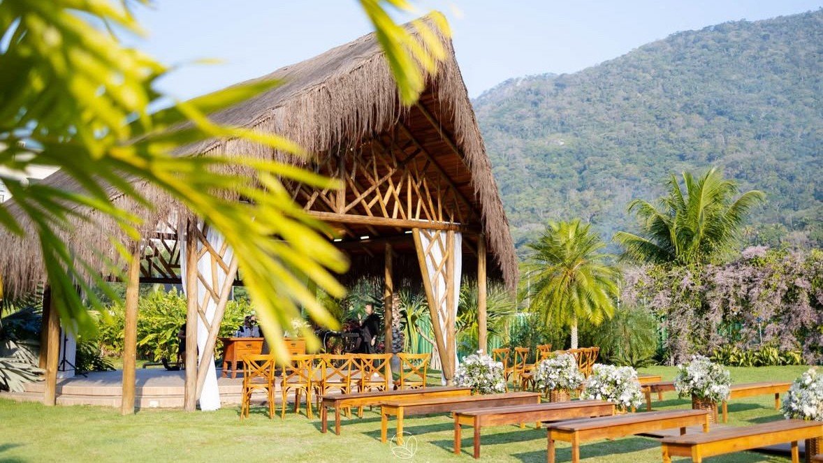 A cerimônia acontecerá ao ar livre, logo após o pôr do sol, e em seguida receberemos todos vocês para a recepção no salão climatizado, com toda a estrutura e conforto para que possamos aproveitar essa noite inesquecível juntos.